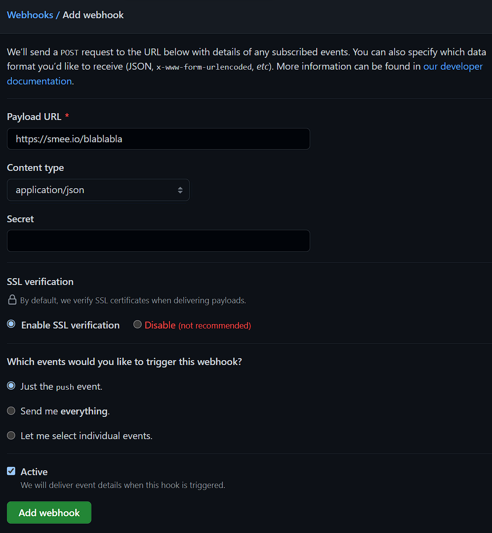 $ smee --url https://smee.io/blablabla --path /github-webhook/ --port 8080