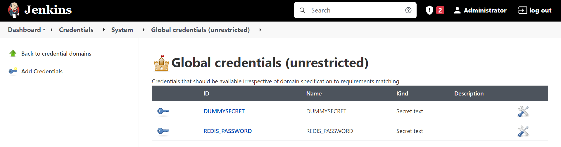 Langkah ini diperlukan untuk me-masking password Redis yang telah kita definisikan di file docker-compose.yml pada baris ke 26. Password ini digunakan oleh Jenkins tiap kali mengakses Redis, baik untuk memperoleh atau mengeset suatu key. Alih-alih meng-hardcode password yang tentunya tidak aman, tambahkan password ini ke fitur Credentials Jenkins.