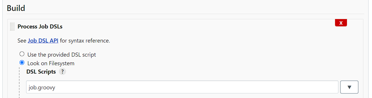 Di bagian Build, klik menu dropdown Add Build Step lalu pilih Process Job DSLs. Masih di bagian Build, pilih Look on Filesystem dan ketik job.groovy di kolom isian DSL Script.