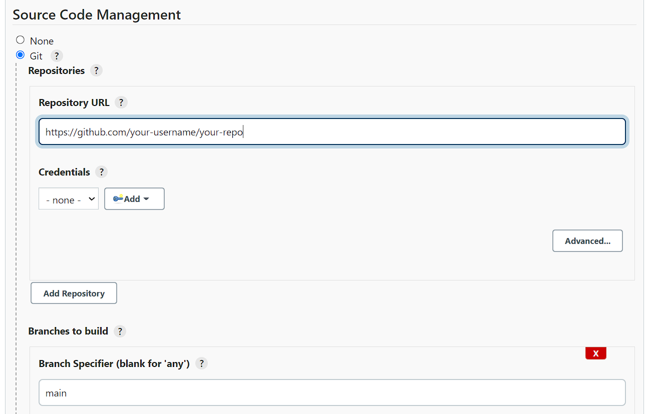 Untuk integrasi ke repositori, masih di halaman Configure yang sama, centang GitHub hook trigger for GITScm polling di bagian Build Triggers. Kemudian, pilih Git di bagian Source Code Management. Di sini, cukup 2 kolom isian saja yang harus disesuaikan: Repository URL dan Branch Specifier. Repository URL diisi dengan nama repositori file job.groovy disimpan. Sedangkan Branch Specifier isi saja main.