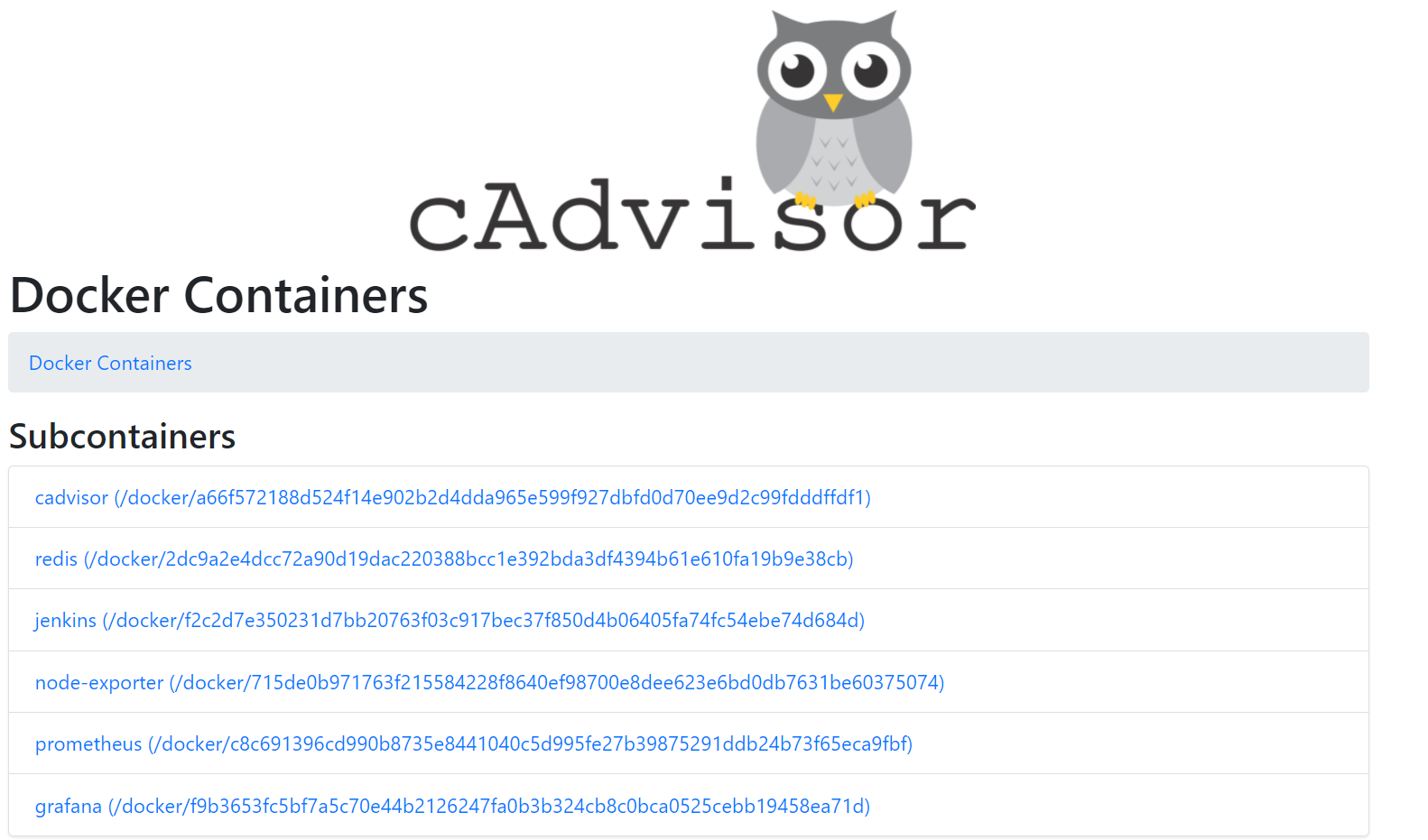 Pastikan cAdvisor telah berjalan dengan baik dengan cara akses ke dashboard cAdvisor http://localhost:8080/docker melalui browser. Lihat di bagian Subcontainers. Semua kontainer yang sedang berjalan ditampikan di sini.