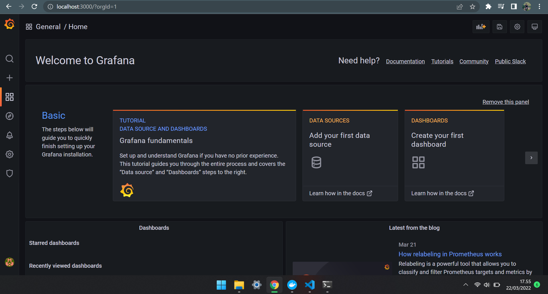 Akses dashboard Grafana di http://localhost:3000. Login dengan username admin dan password admin.